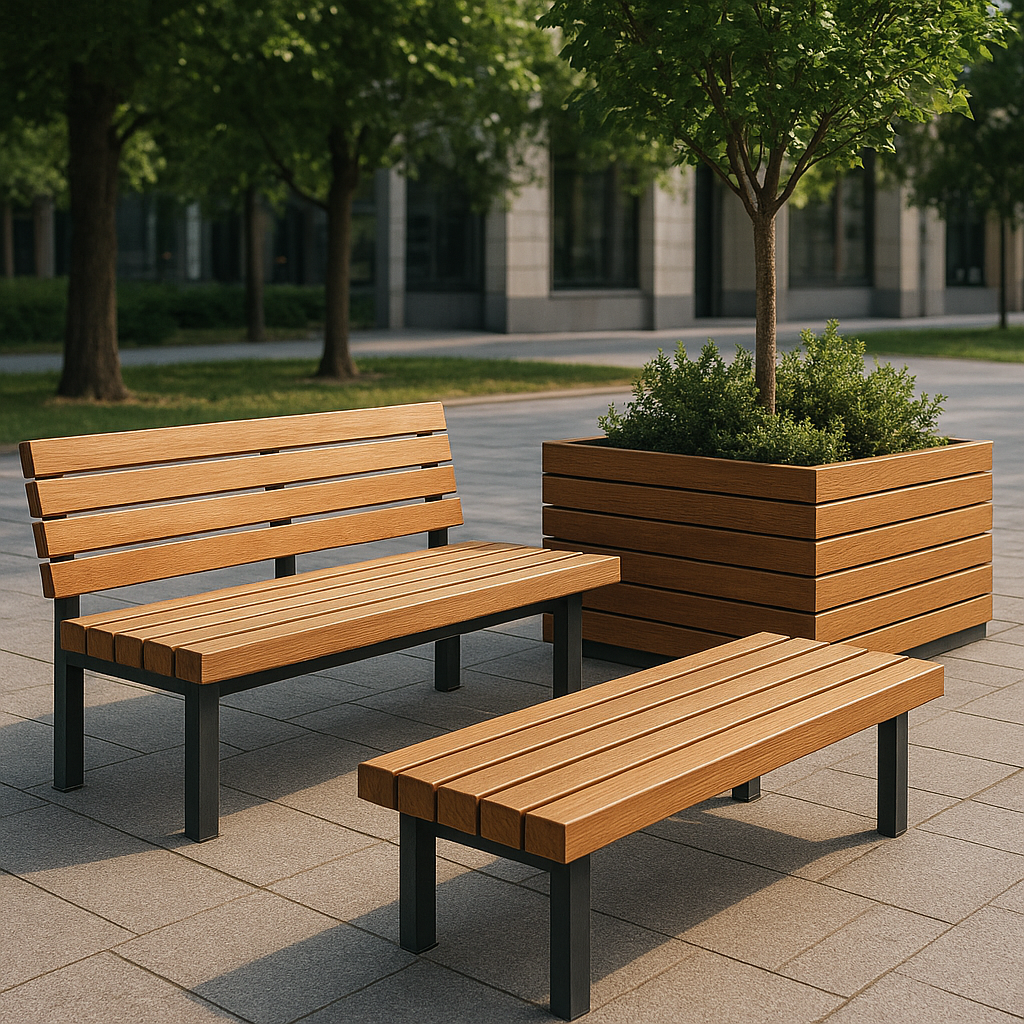 W przestrzeniach takich jak place miejskie lub bulwary nad rzeką drewno stosuje się na ławki, pergole, elementy małej architektury i nawierzchnie tarasowe. Wnosi ono ciepło i zachęca do relaksu, a jednocześnie dobrze harmonizuje się z zielenią, kamieniem czy stalą.